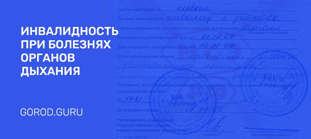 I группа инвалидности присваивается в случае, если нарушения функций дыхательной системы характеризуются клиническими проявлениями заболевания тяжелой степени с ХДН III степени, ХЛСН IIБ или III стадии, в том числе осложнениями и комбинированным поражением других органов и систем организма.